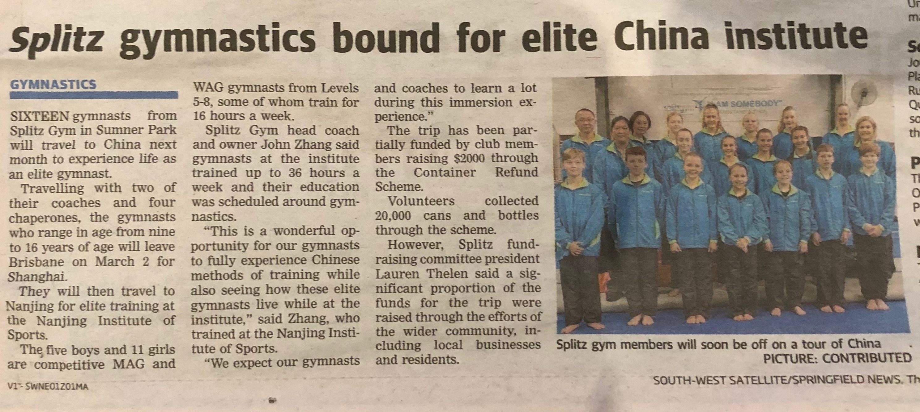Splitz Gym Gymnastics bound for elite China Institute of Sport Posted on February 24, 2019September 16, 2020 by gdisbh_admin Splitz Gym gymnasts on the 2nd of March are heading to China to train at their Institute of SportsĀ in Nanjing.